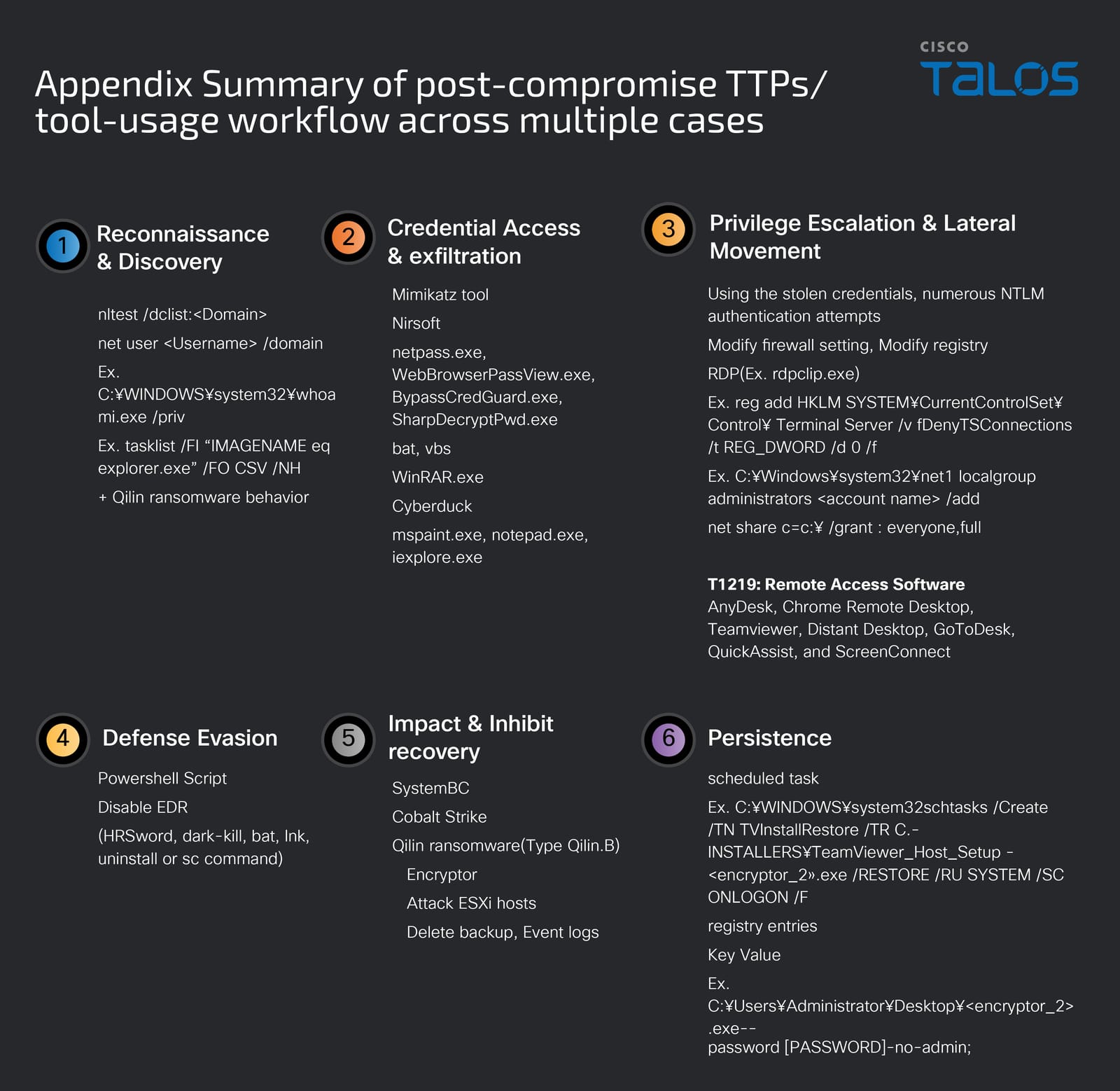 The stolen credentials have been found to enable privilege escalation and lateral movement, abusing the elevated access to install multiple Remote Monitoring and Management (RMM) tools like AnyDesk, Chrome Remote Desktop, Distant Desktop, GoToDesk, QuickAssist, and ScreenConnect. Talos said it could not definitively conclude if the programs were used for lateral movement.
