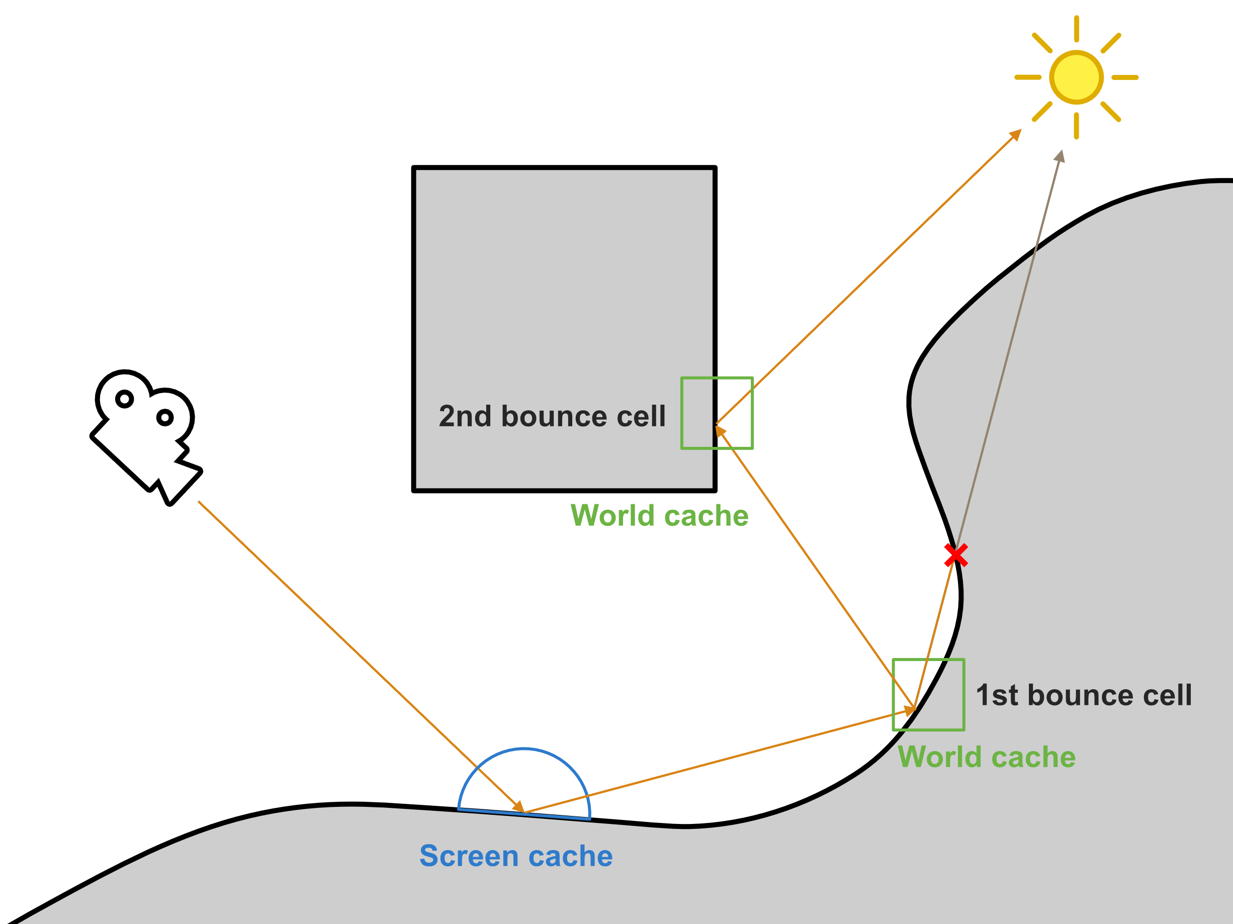 After the 1st hash grid cells have been created from rays traced from the screen probes, additional rays are traced from those hash grid cells, or 1st bounce cells, and another level of hash grid cells are created at the hit points of those rays, called the 2nd bounce cells. The 1st bounce cells get the direct light contribution, as well as an indirect light contribution from the 2nd bounce cells, while the 2nd bounce cells only get a direct light contribution.