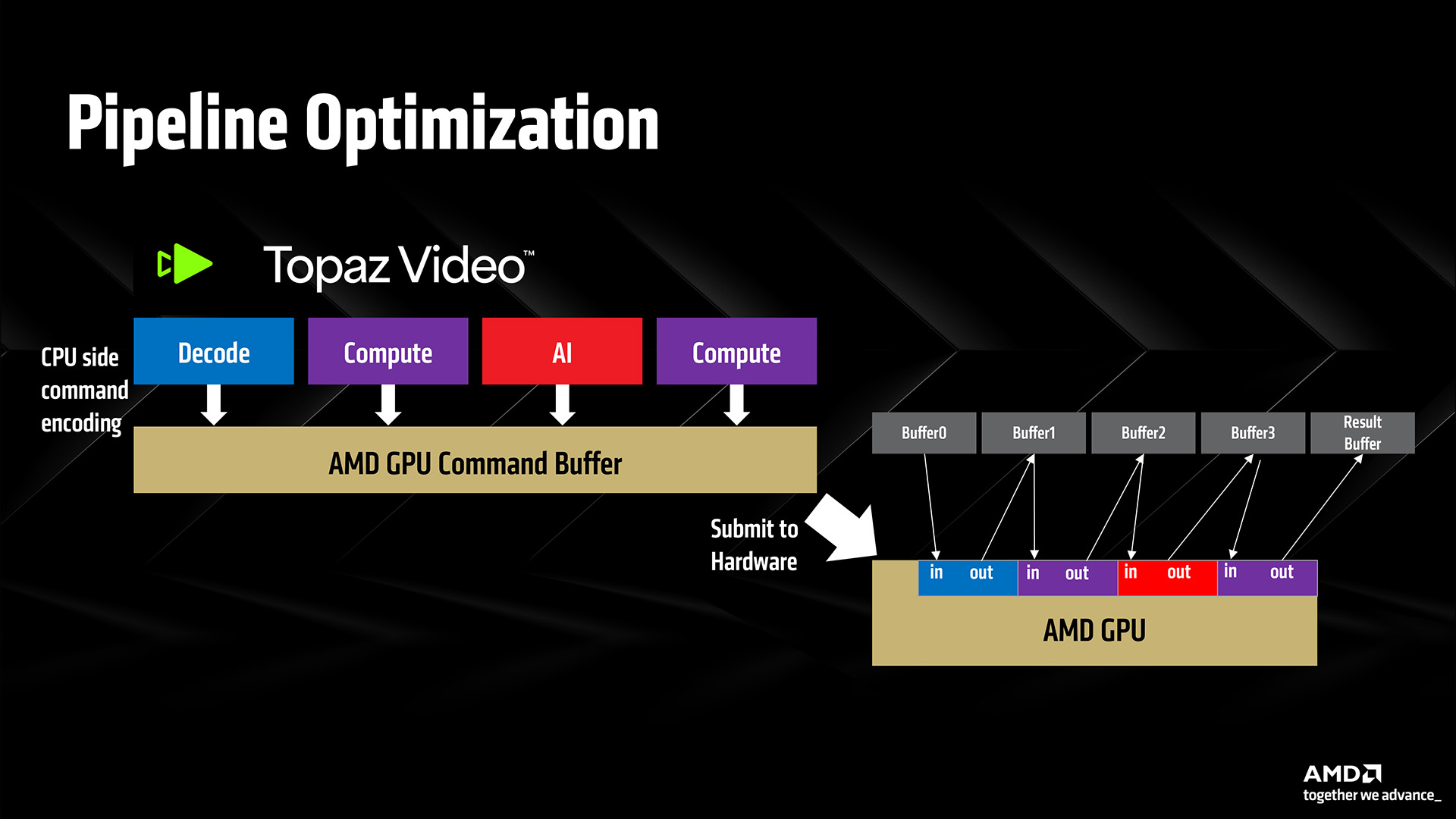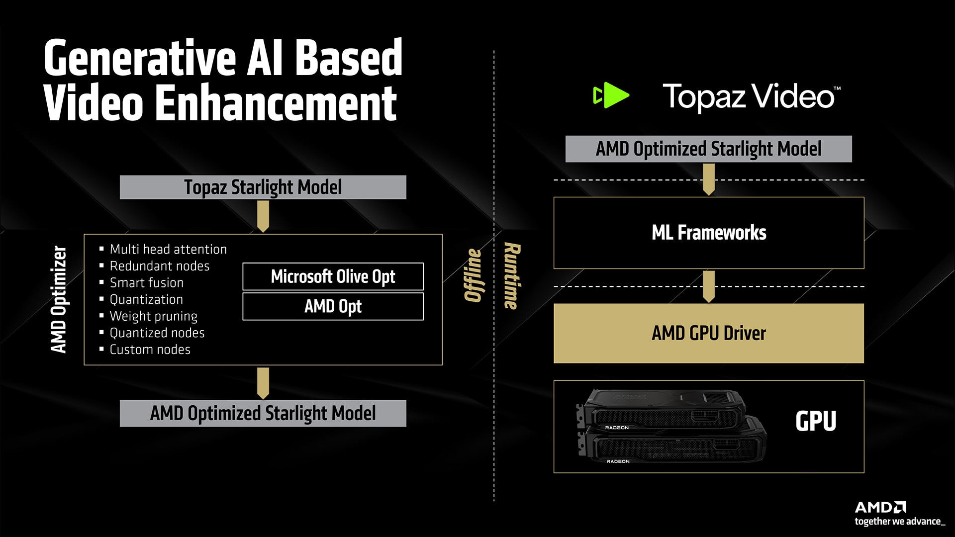 • The collaboration between Topaz Labs® and AMD enabled the efficient deployment of AI-powered video enhancement models, meticulously optimized for AMD GPU architectures using AMD Optimizer toolchains. These optimizations maximize parallel processing throughput while minimizing latency for real-time performance.