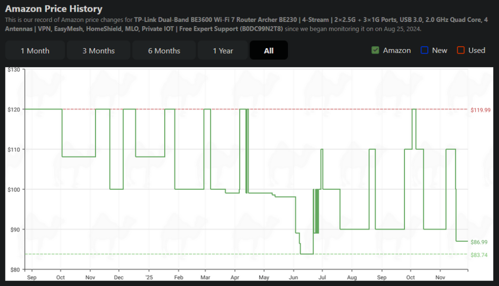 As you can see on the graph below, this router is only $3 away from its lowest price, and since it is a WiFi 7 router, the performance, speed, and stability should be next-level. While it doesn’t offer the 6GHz band, the frequencies it offers have a high ceiling and should provide a great gaming and working experience. It also works seamlessly with range extenders and EasyMesh routers to create a network encompassing the entire home, ensuring that there are no dead zones.