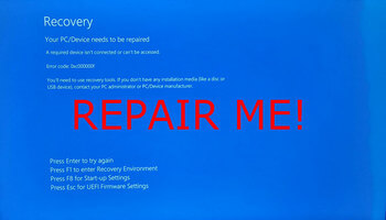 I was surprised to be greeted by this monstrosity for the reasons given, and having seen it before on clients’ PCs, I was filled with dread, knowing that I would probably have to go full nuclear. I was right because none of the options did anything at all, including F1 for Recovery Environment, F8 for Start-Up Settings, and all the other options, including the Restore Point option. In fact, all the options kicked me back to the UEFI. Selecting Repair My PC was a joke – I knew that from previous experience as soon as I selected the option – because I was told your PC cannot be repaired! If I had a pound for every time Recovery has failed me, I’d be very rich by now.